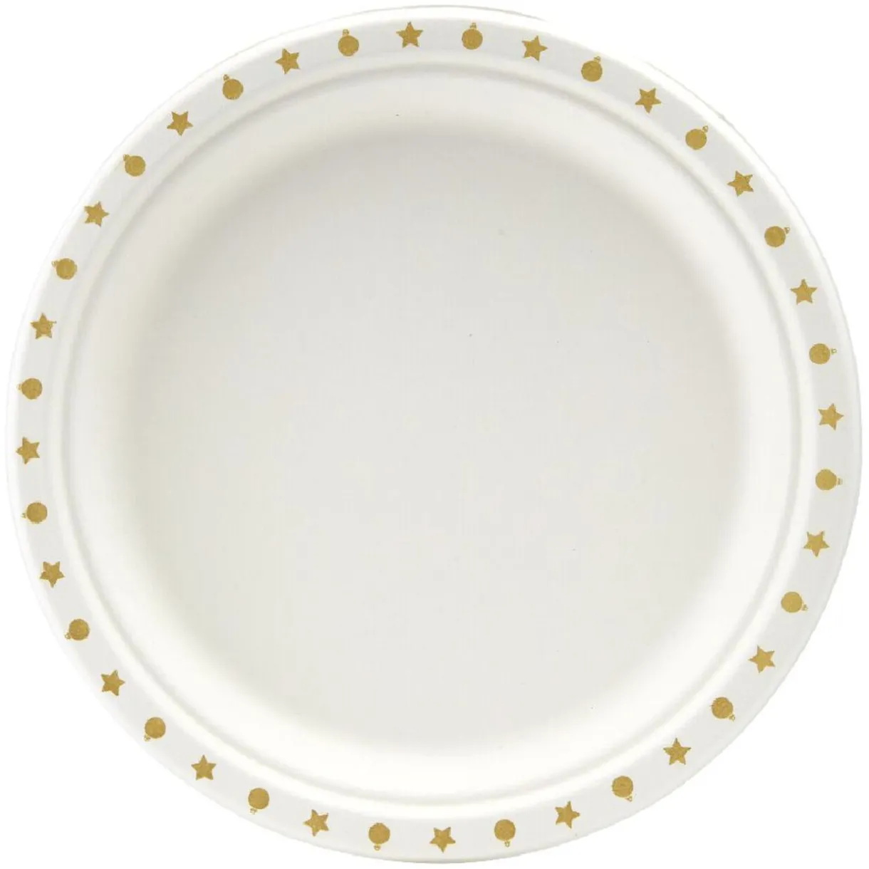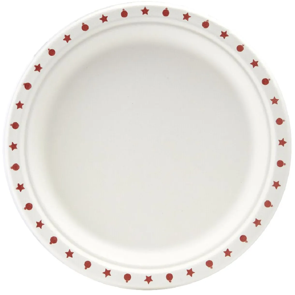 Lot de 20 assiettes blanches en canne à sucre, avec bord imprimé étoiles et boules de Noël.