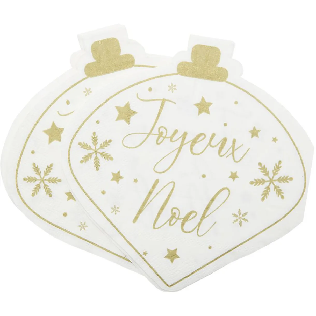 Lot de 10 serviettes en papier blanc et doré en forme de boules de Noël, idéal pour créer une table de réveillon festive et élégante.