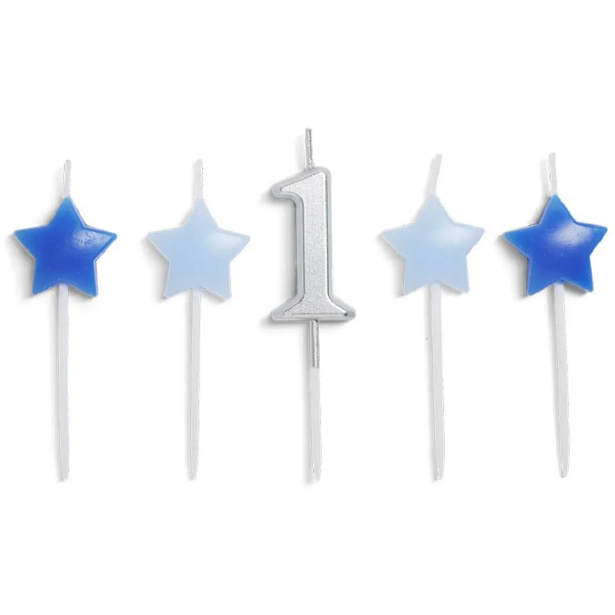 Ajoutez une touche élégante et ludique à votre évènement avec la bougie argentée en forme de chiffre « 1 » accompagnée de 4 bougies piques en forme d’étoile dont 2 blanches et 2 bleues.