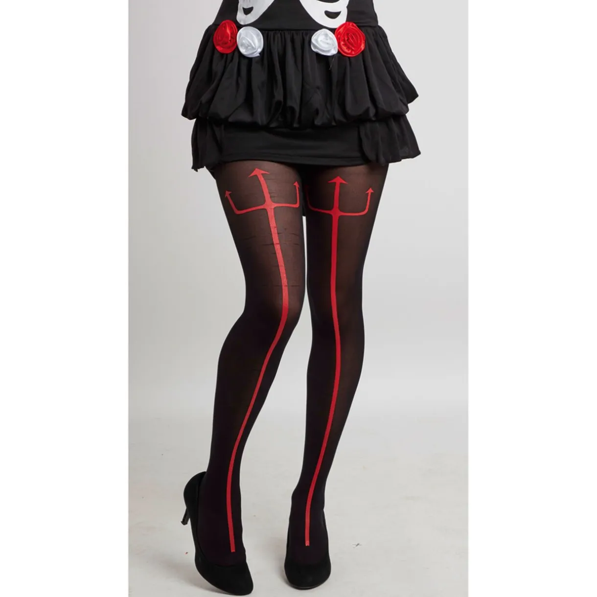 Pour compléter votre costume de diablesse avec notre robe, habillez-vous avec ces collants tridents pour être vraiment maléfique de la tête au pieds.
