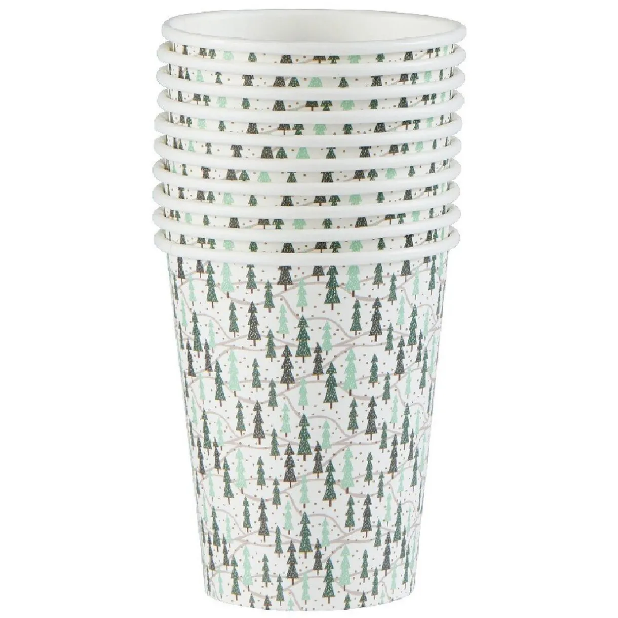 Lot de 10 gobelets jetables avec motifs forêt de sapins verts et blancs, d’une contenance de 25 cl. N’hésitez pas à compléter votre table avec les assiettes jetables assorties, réf. 506045 !