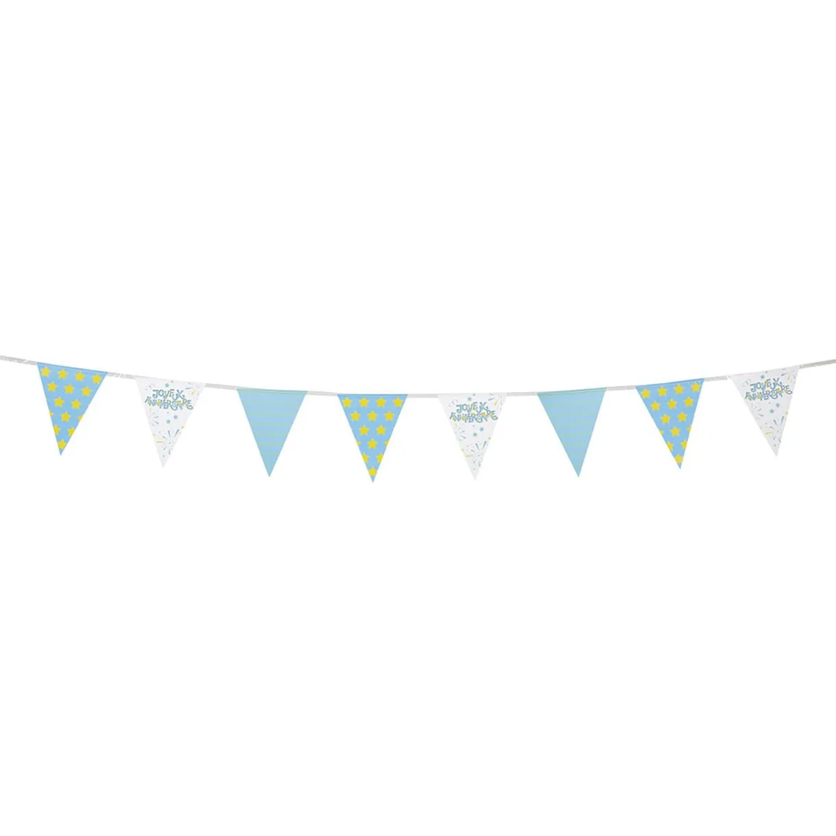 Apportez la touche finale à votre décoration festive avec cette guirlande à fanions à l’inscription « Joyeux anniversaire » et à ses feux d’artifice de couleur bleu, vert et jaune.