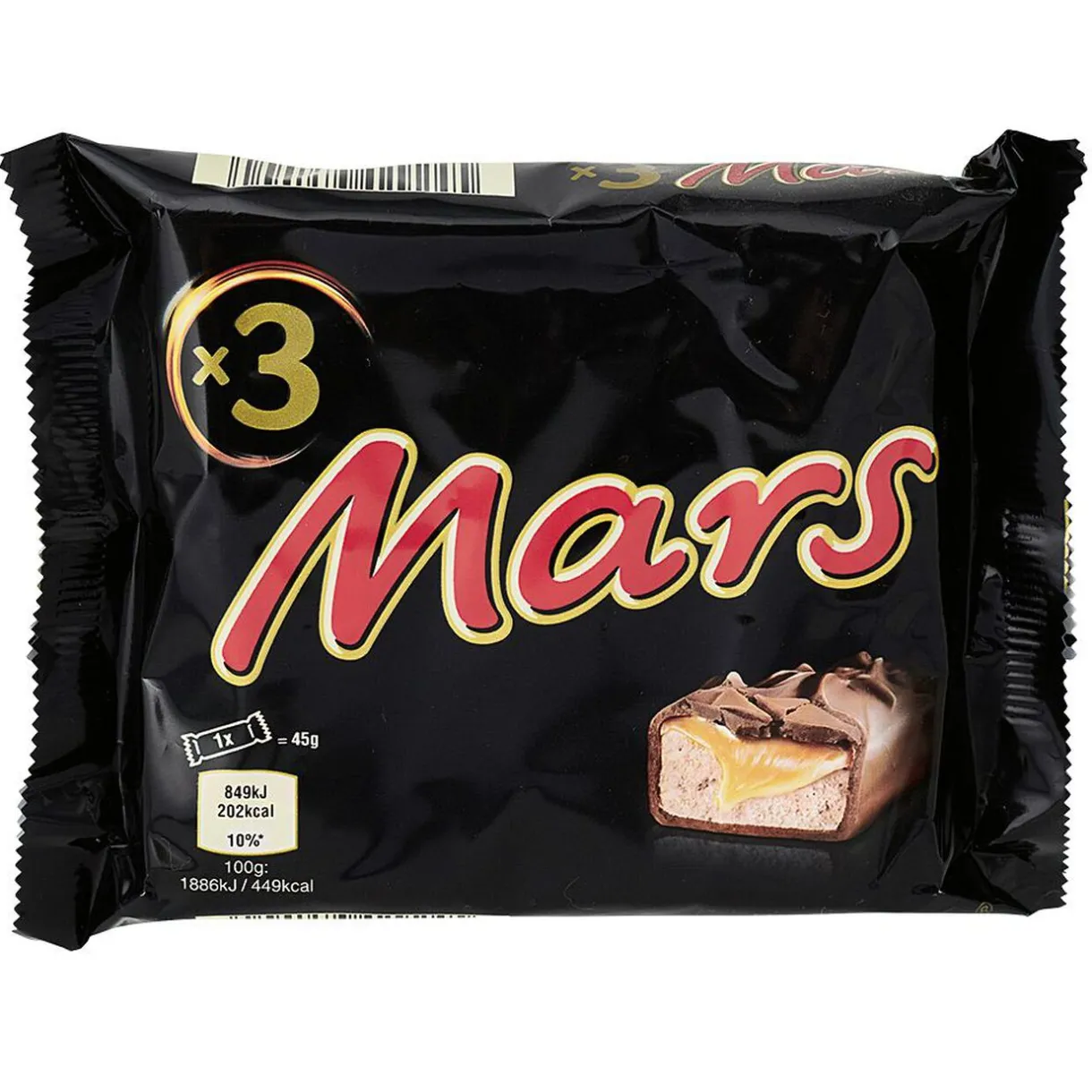 Paquet de 3 barres Mars chocolatées fourrées au caramel.