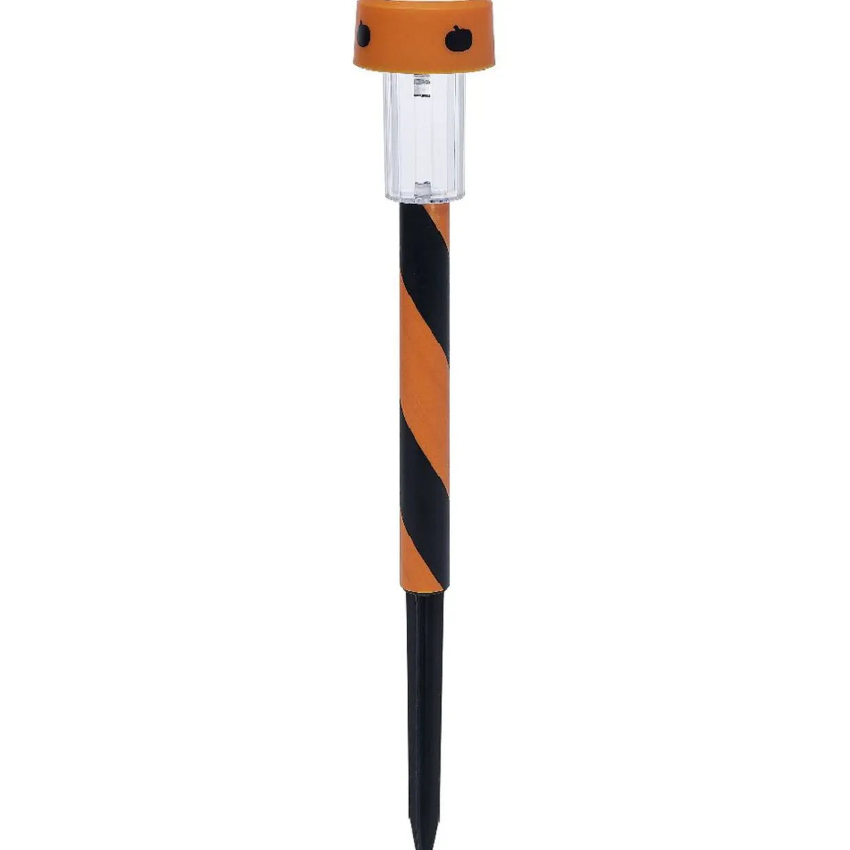 Borne LED solaire à planter, de coloris orange et noir avec éclairage blanc froid, pour peaufiner votre décoration extérieure le soir d’Halloween !