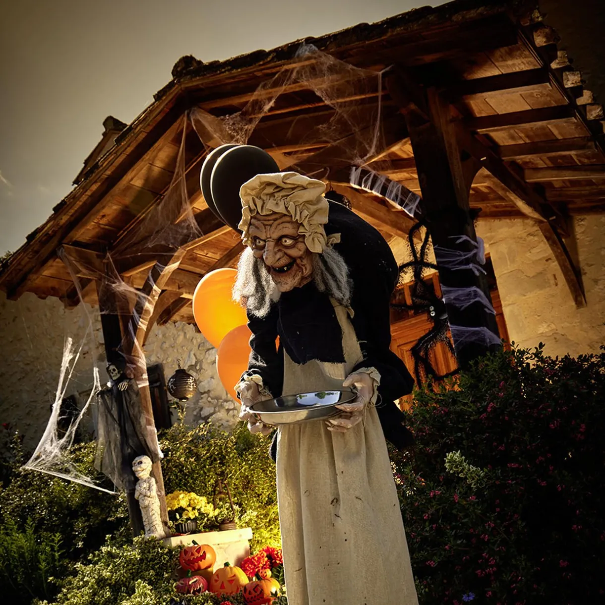 Une vieille dame animée avec un plateau dans ses mains. Idéal pour pouvoir incorporer à une soirée Halloween.
