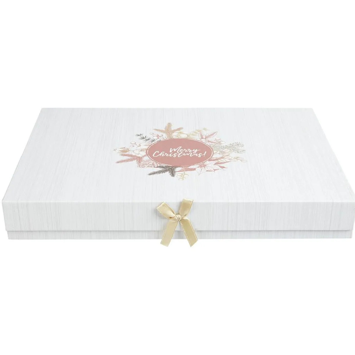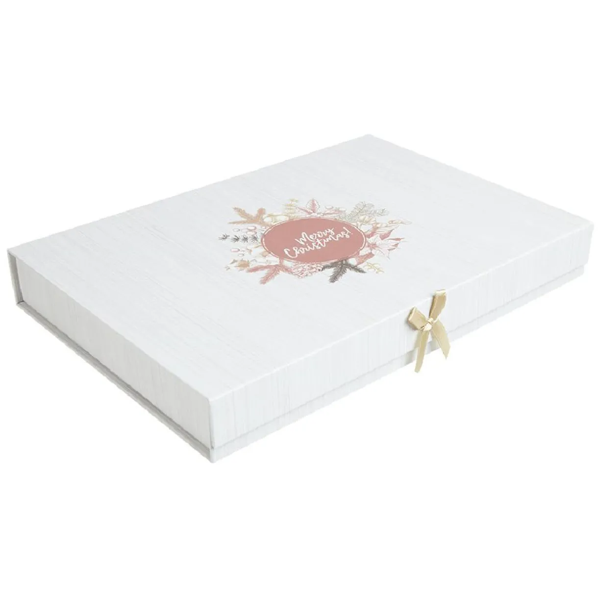 Boîte à cadeau blanche inscription « Merry Christmas » avec petit noeud jaune sur le devant, idéale pour apporter un brin de nature à vos cadeaux de Noël.