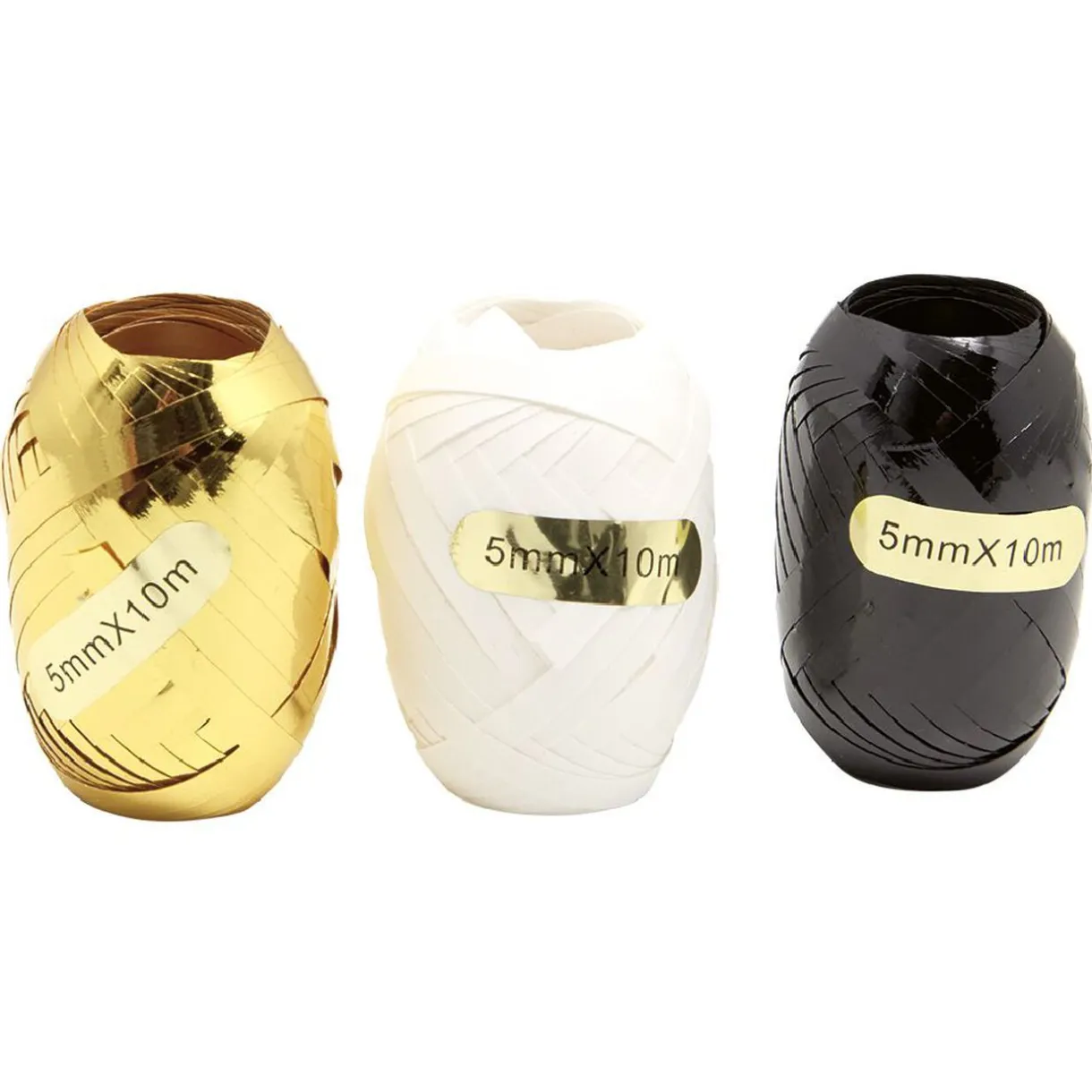 Ensemble de 3 bolducs brillants pour emballer vos cadeaux de Noël dont 1 doré, 1 noir et 1 blanc.