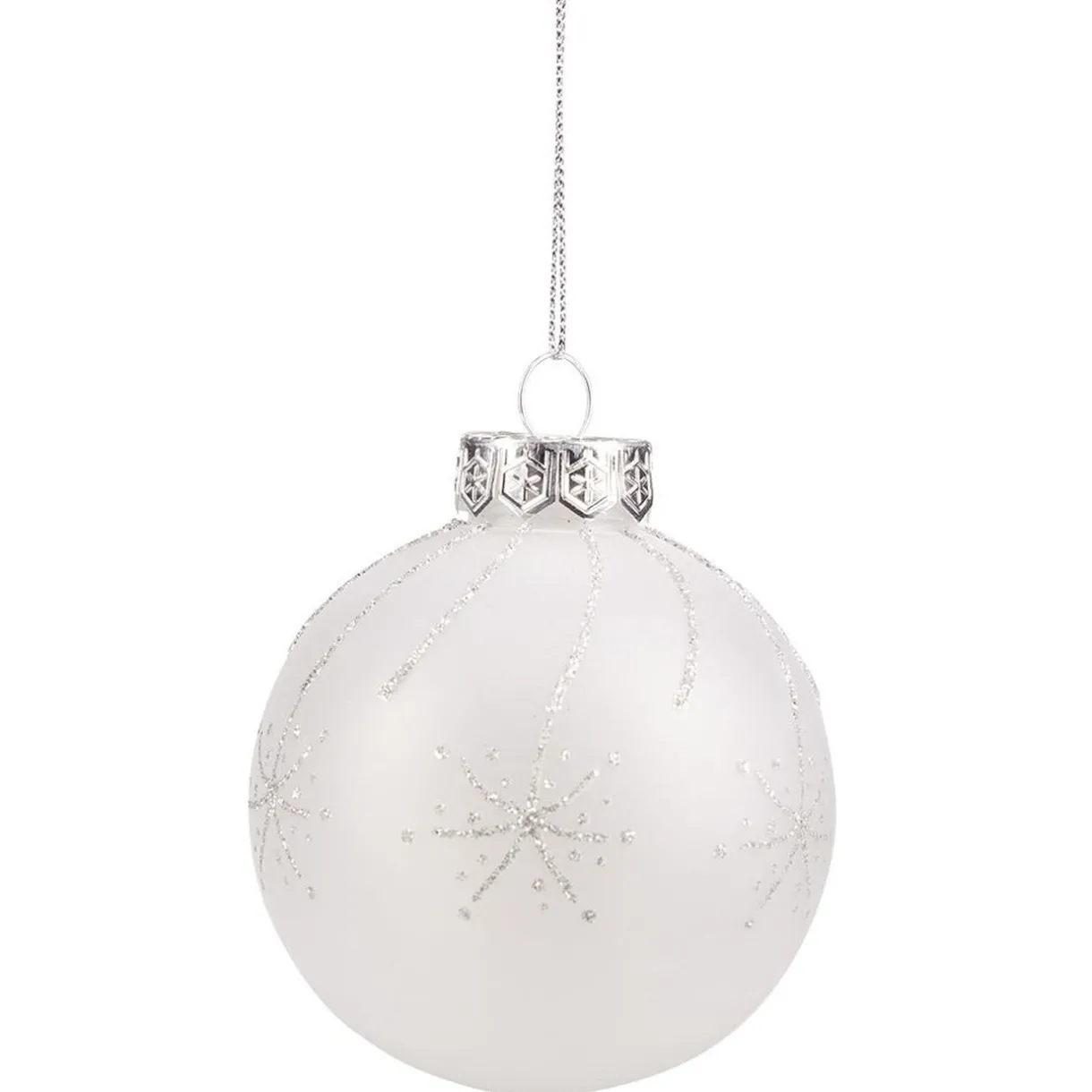 Boule de Noël blanche à motif étoiles paillettées argentées, parfaite pour compléter la décoration de votre sapin !