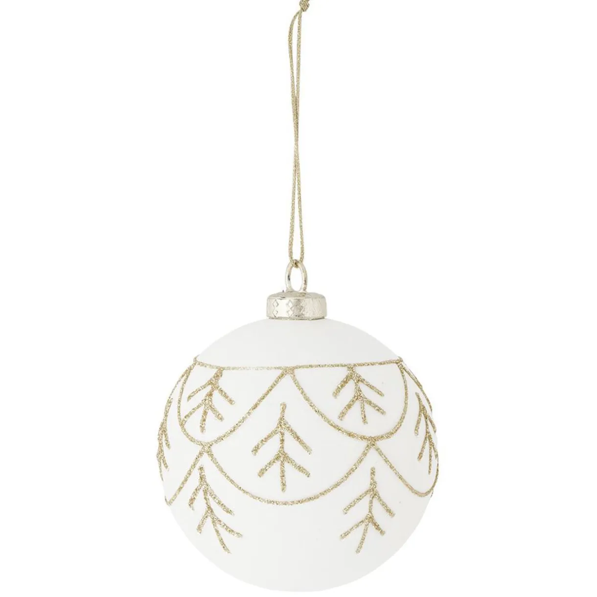 Cette boule de Noël blanche ornée d’un motif à paillettes dorées est idéale pour compléter la décoration de votre sapin.