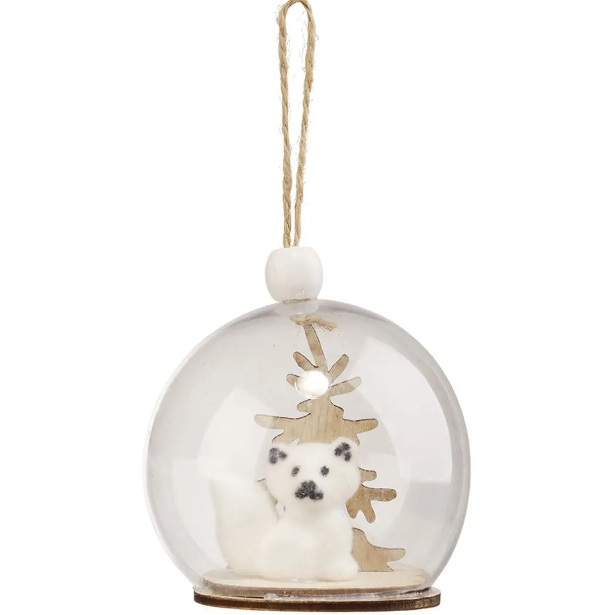 Boule de Noël à poser ou suspendre avec petit renard blanc et sapin en bois à l’intérieur.