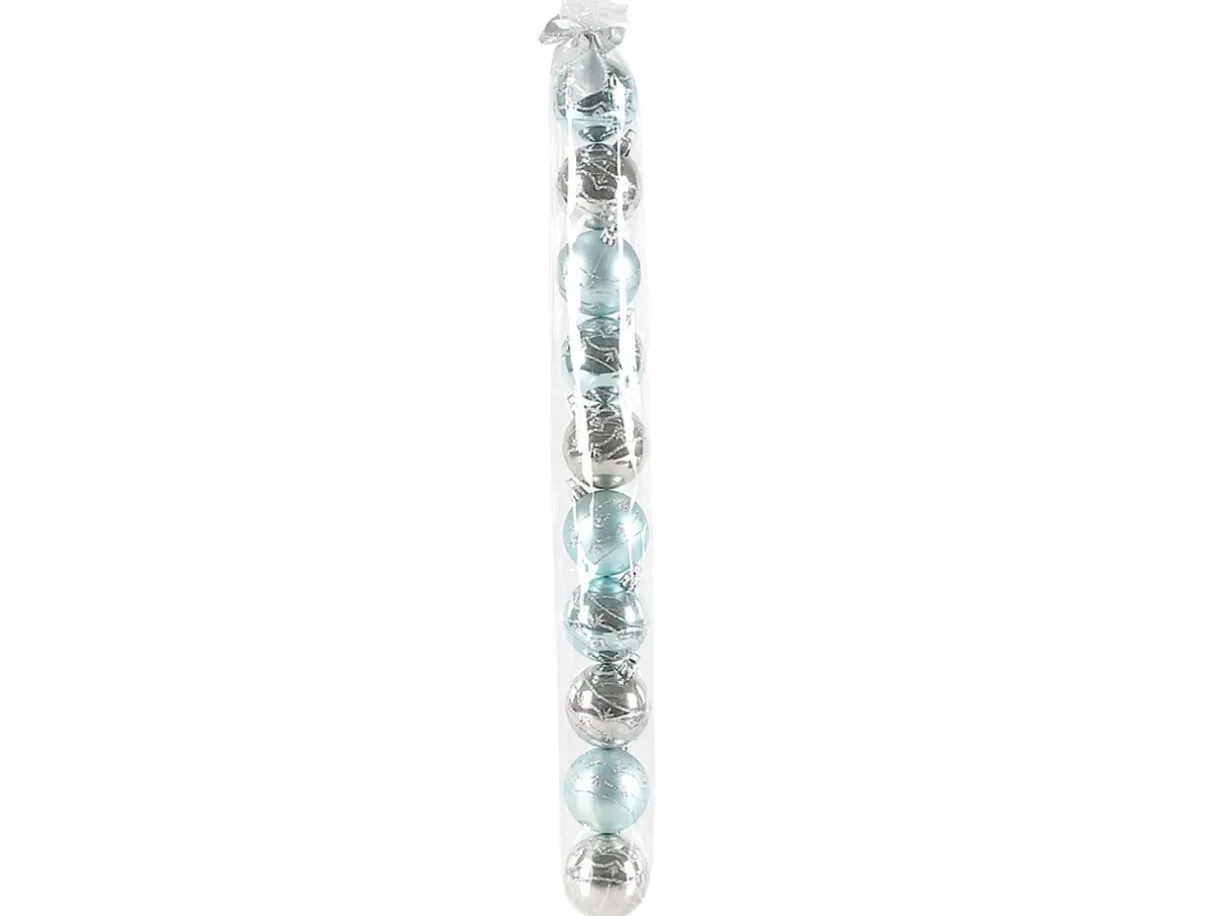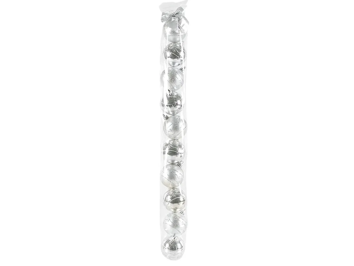 10 boules de Noël, en plastique, Ø 6 cm, brillantes et avec décorations pailletées.