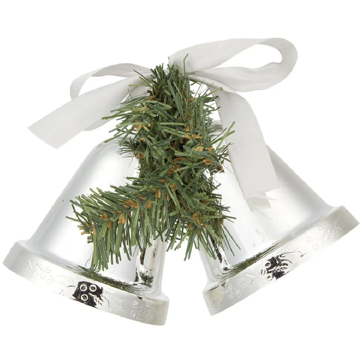 2 cloches de Noël argentées avec une branche de pin à suspendre au sapin, essentiel pour une décoration de Noël réussie.