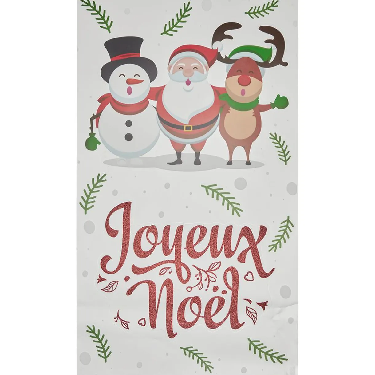 Autocollant pour fenêtre représentant un Père Noël, un bonhomme de neige et un renne qui chantent pour décorer vos fenêtres à Noël.
