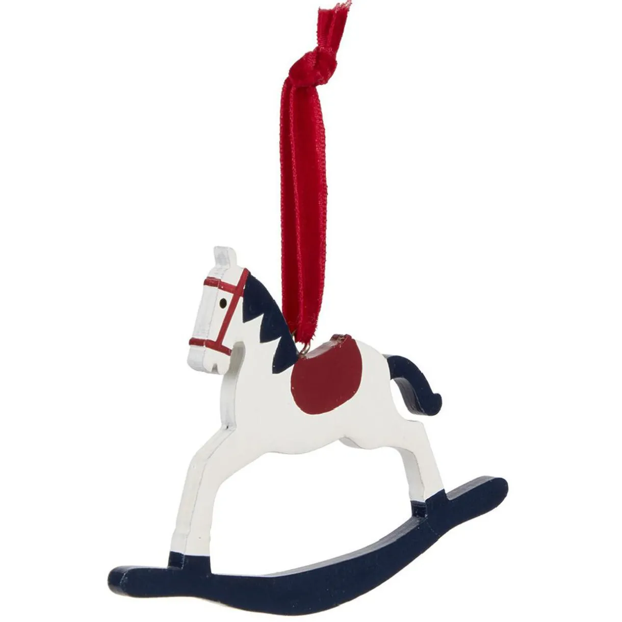 Cheval à bascule en bois blanc et rouge à suspendre à votre sapin pour lui apporter une note vintage.