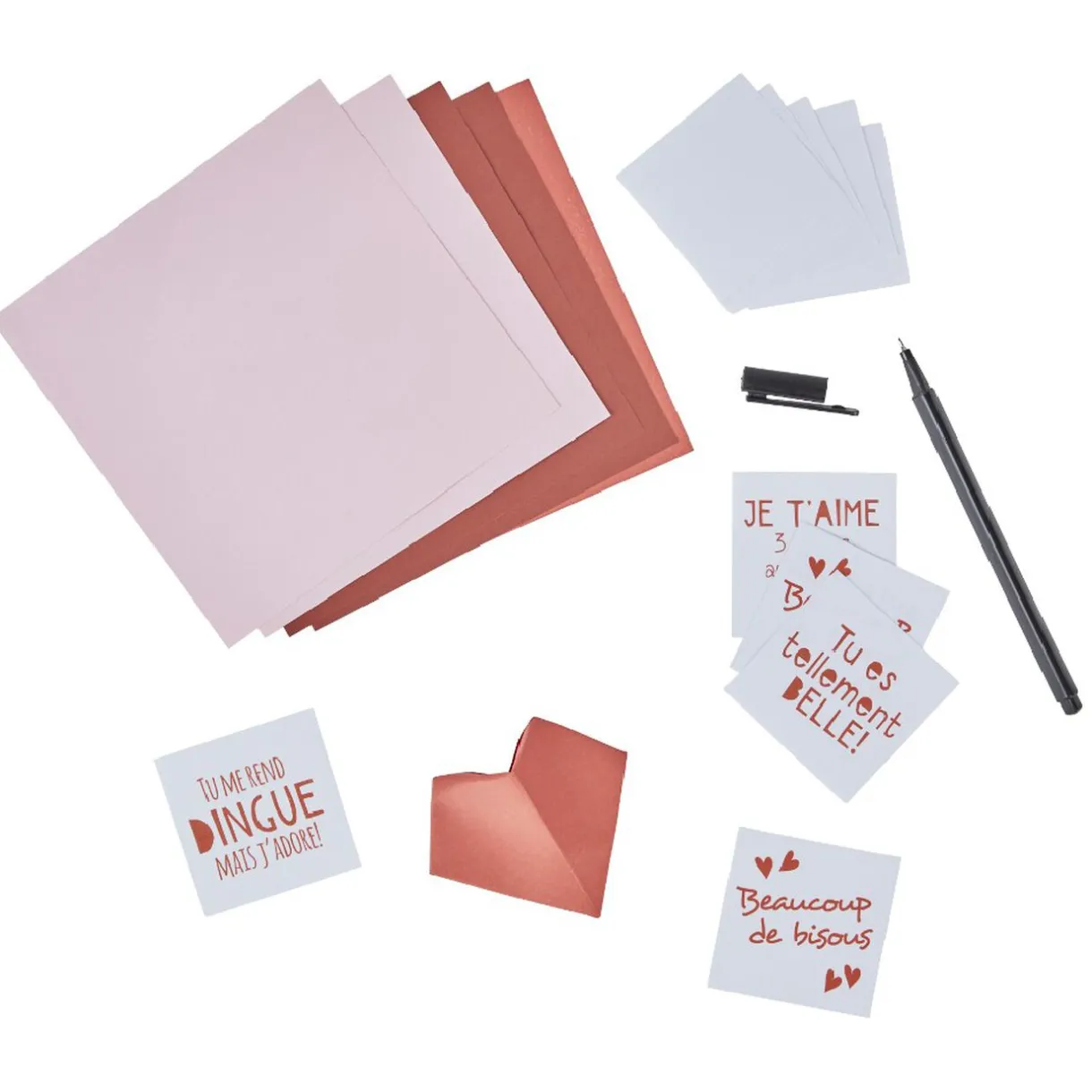 Confectionnez 6 jolis coeurs façon origami avec messages personnalisés grâce à ce kit de fabrication.