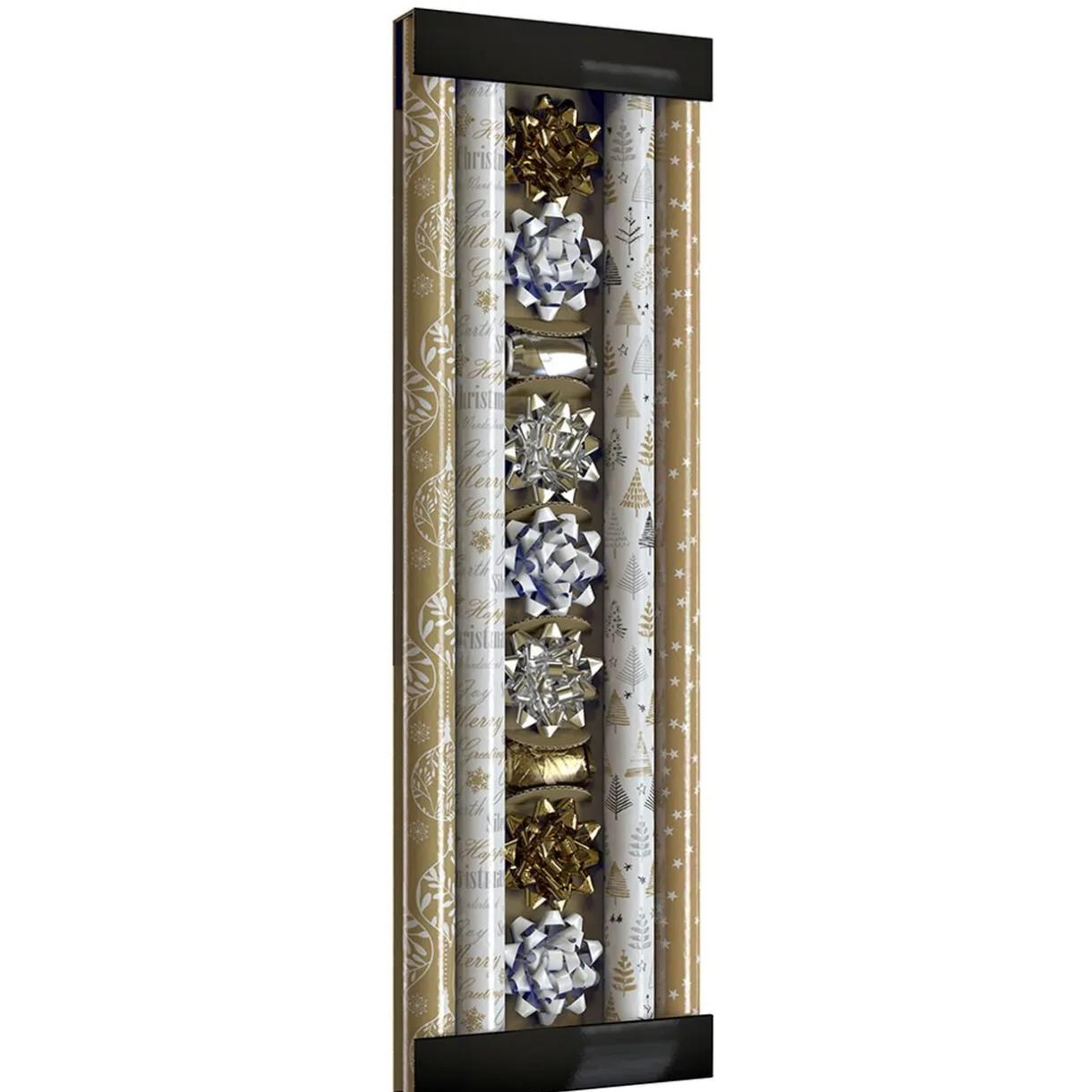 Réalisez de superbes emballages cadeaux pour Noël grâce à ce lot comprenant 4 rouleaux en papier imprimé, 7 noeuds et 2 bolducs assortis dorés et argentés.