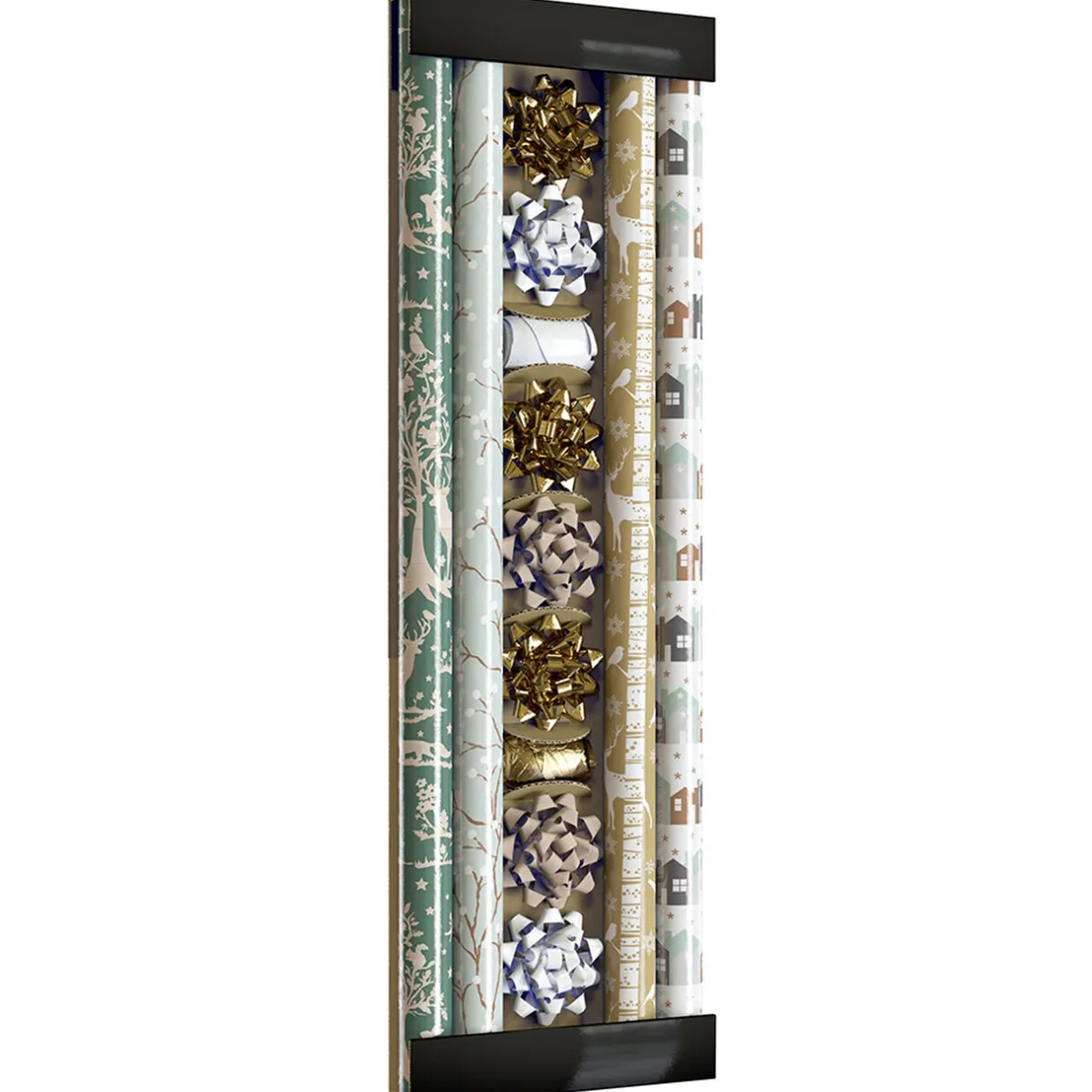 Ensemble de 4 rouleaux de papier cadeau 70×200 cm motifs Noël thème nature accompagnés de 7 noeuds blancs, dorés et marron ainsi que 2 bolducs l’un blanc l’autre doré.