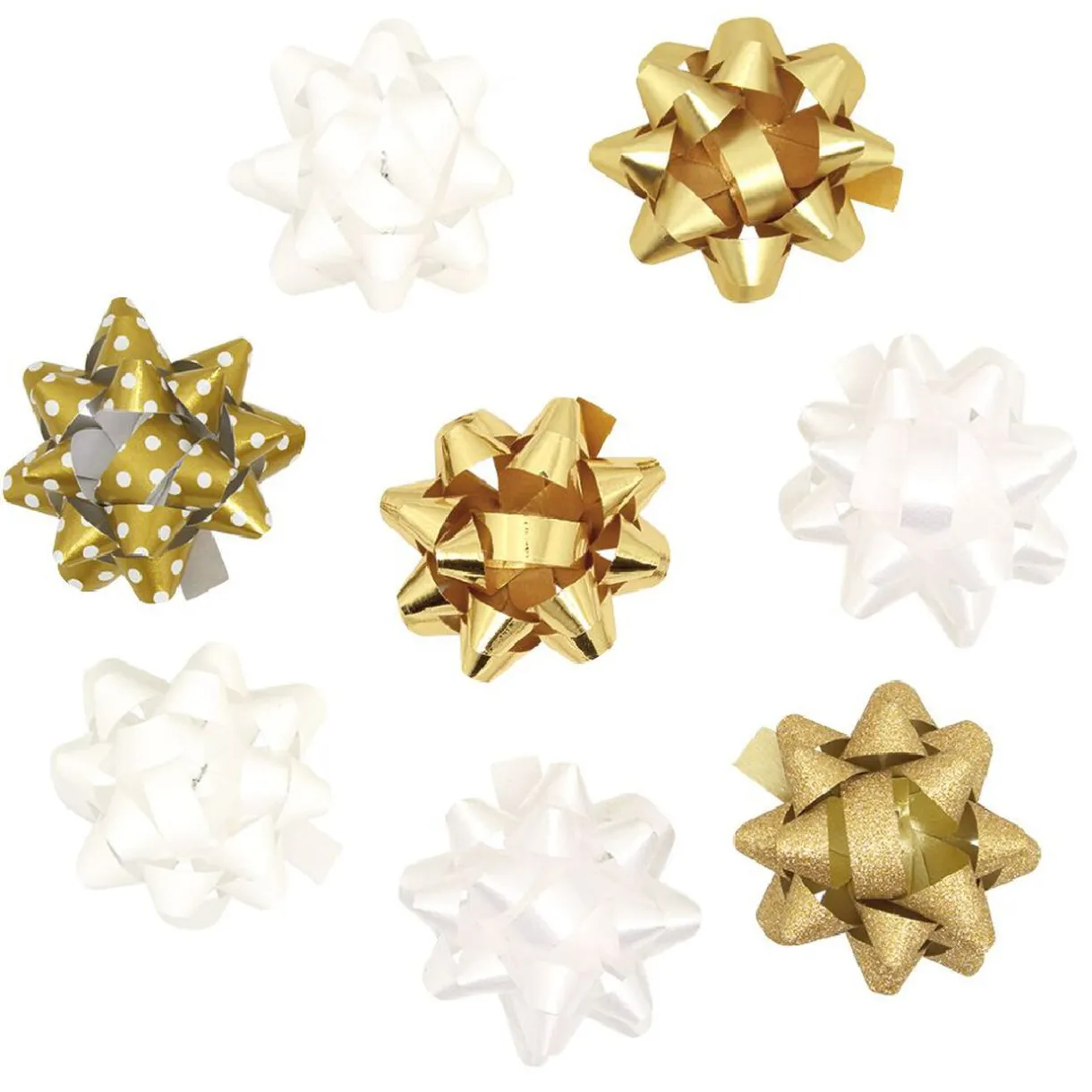 Ensemble composé de 8 noeuds dont 4 dorés et 4 blancs, idéal pour décorer vos papiers cadeaux de Noël.