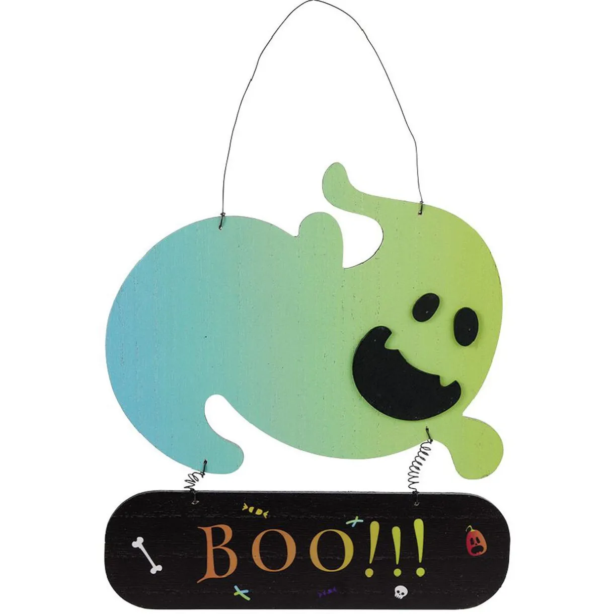 Pour la soirée d’Halloween, décorez votre porte d’entrée avec cette pancarte en bois en forme de fantôme avec inscription « boo !!! ».