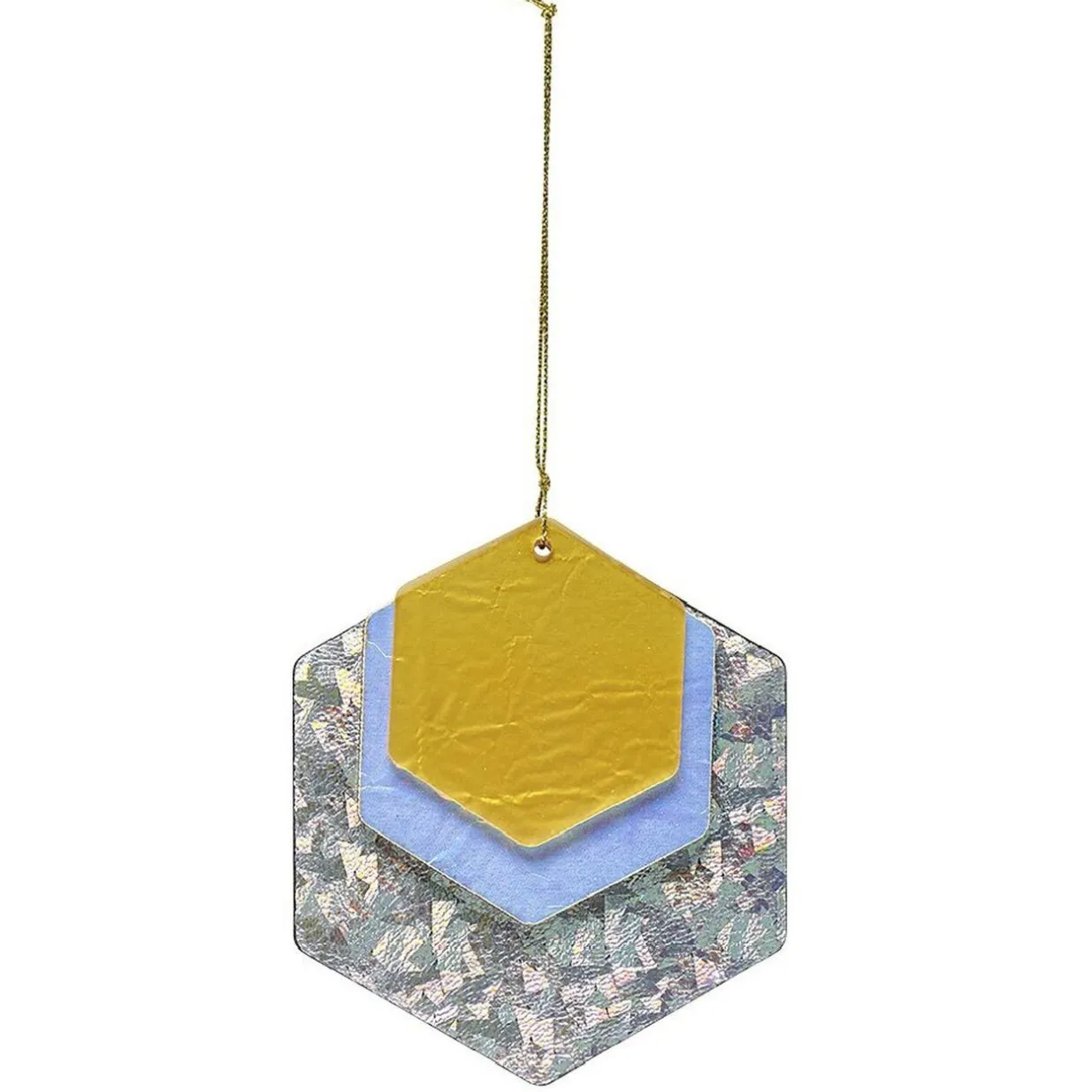 Suspension de Noël en bois couleur argent, jaune et bleue et de forme géométrique.