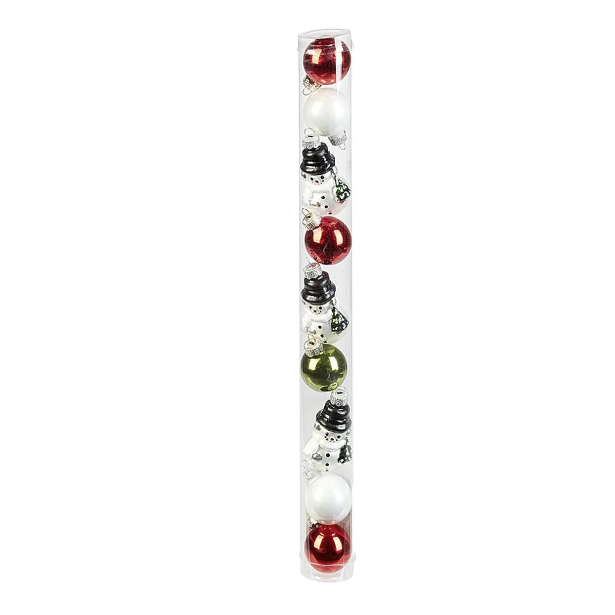 Apportez une touche traditionnelle à la décoration de votre sapin avec cet ensemble de 9 supensions, bonhommes de neige et boules en verre de couleur rouges, vertes et blanches.