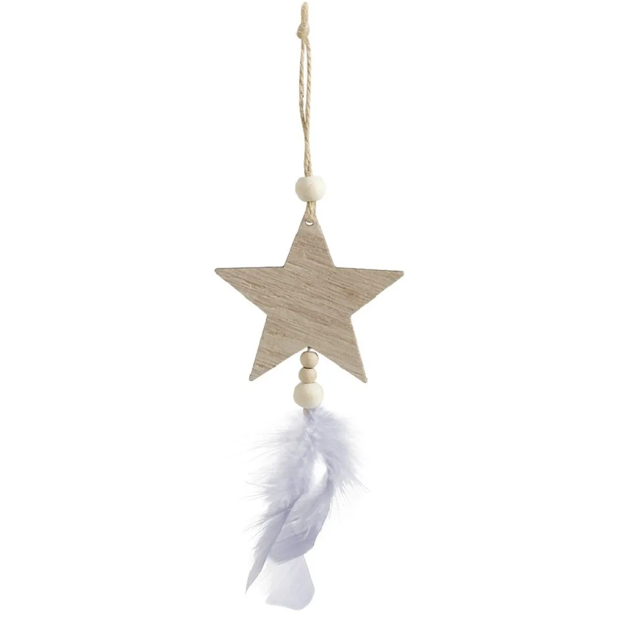 Suspension en forme d’étoile en contreplaqué naturel agrémentée de petites plumes grises, idéale pour apporter une petite touche poétique à la décoration de votre sapin de Noël!