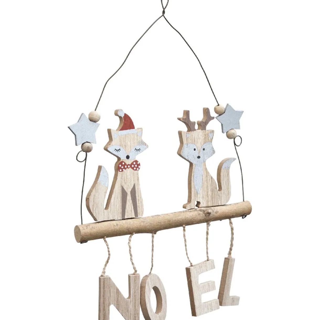 Donnez un esprit nature à votre décoration de Noël avec cette suspension couple de renardsbeige et rouge assis avec lettres NOEL en bois assorti.