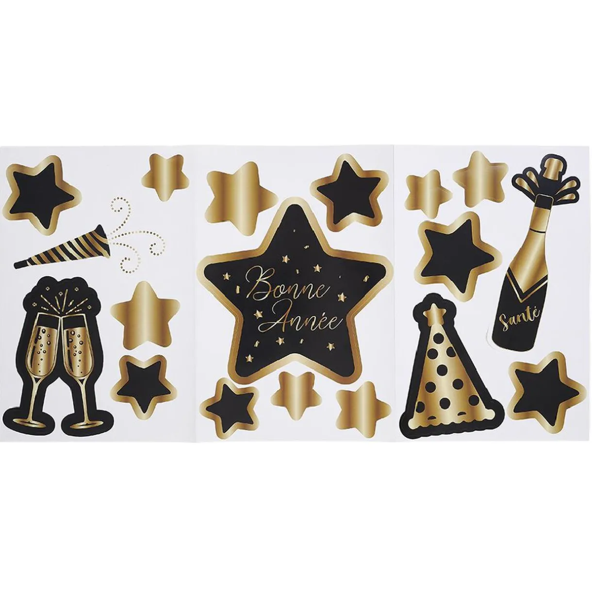 Lot de 18 stickers noirs et dorés avec inscriptions et motifs sur le thème du nouvel an.