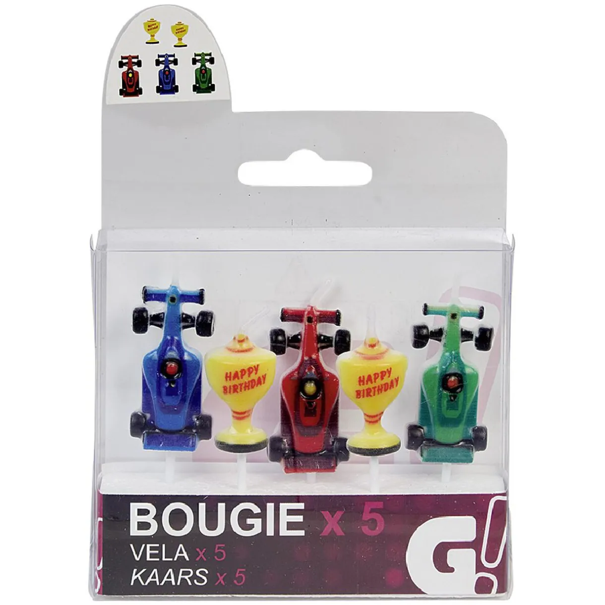 Lot de 5 bougies anniversaire en forme de voiture de course.