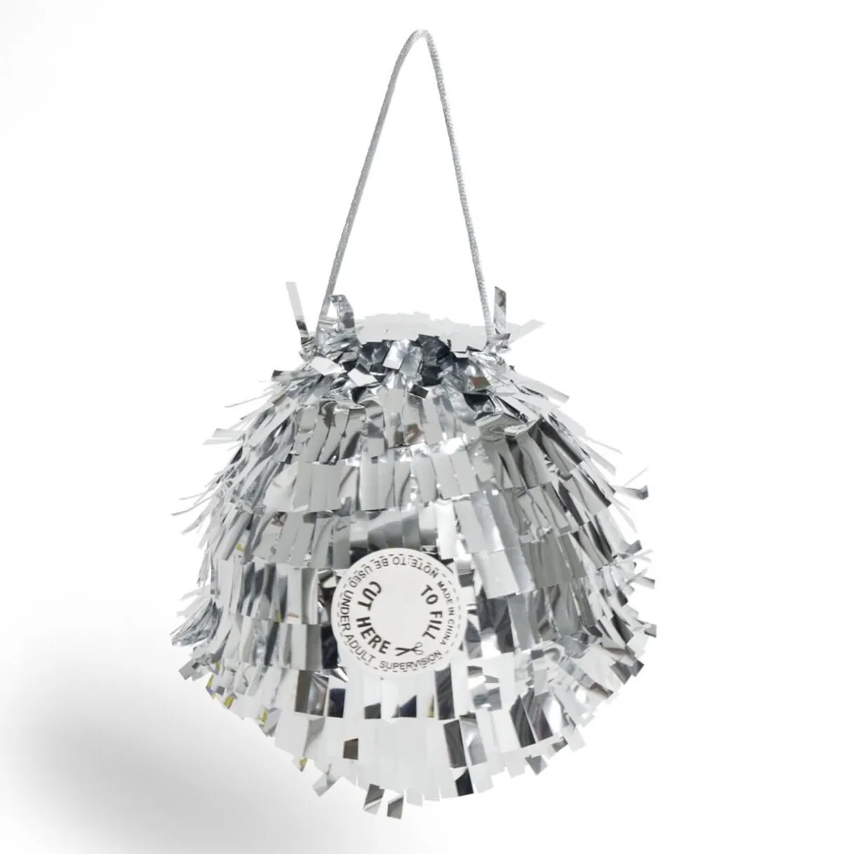 Ajoutez un peu d’ambiance supplémentaire à votre fête grâce à cette piñata à l’apparence de boule disco argentée.