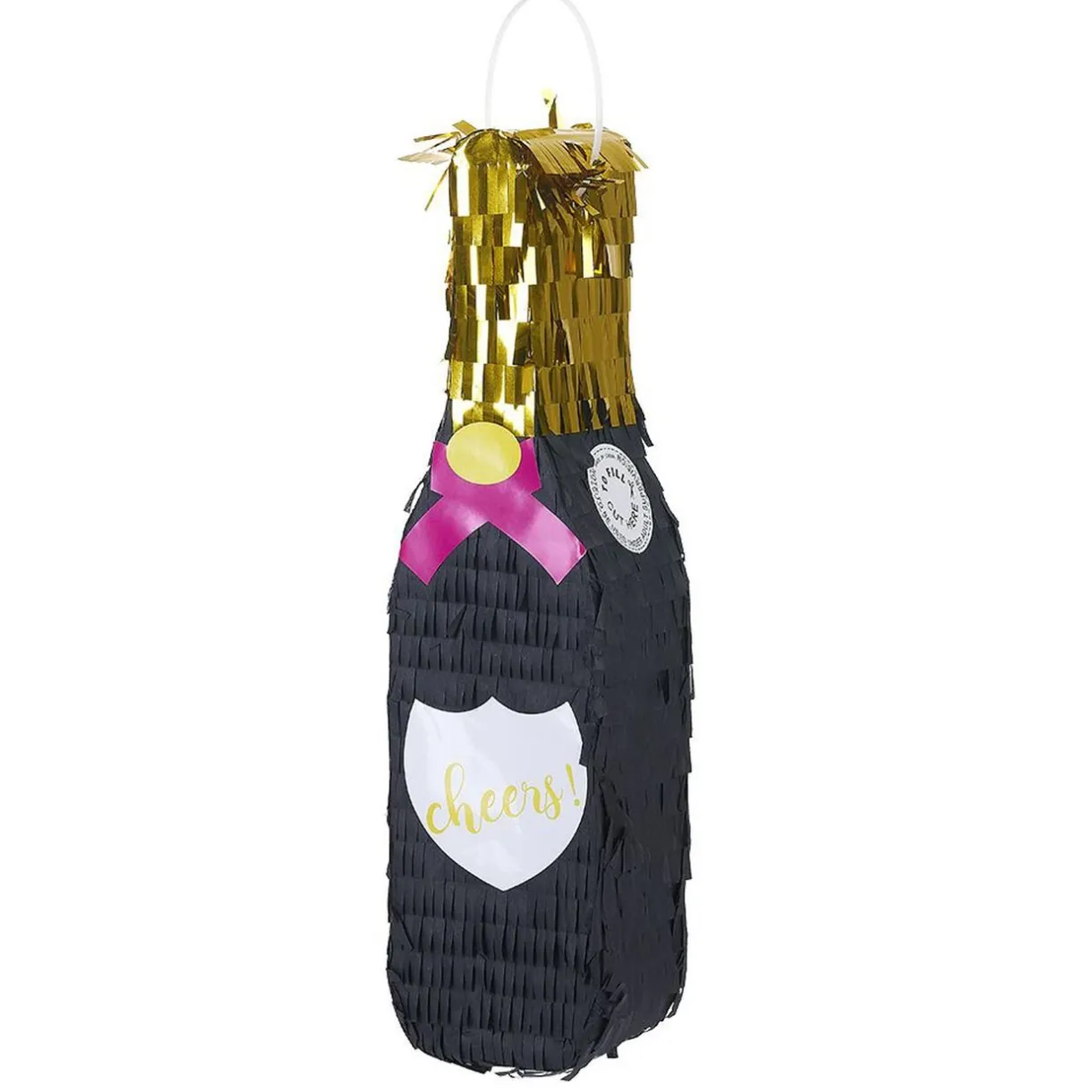 Piñata en forme de bouteille noire et dorée, idéale pour un jour de l’an encore plus festif !