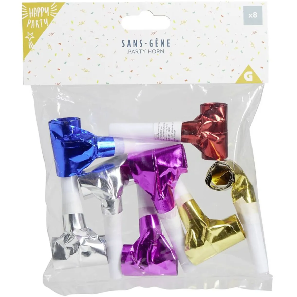 Ce lot de 8 sans-gênes métallisés de couleur dorée, argentée, bleue, rose et rouge est parfait pour les fêtes, les anniversaires ou toute autre occasion festive.