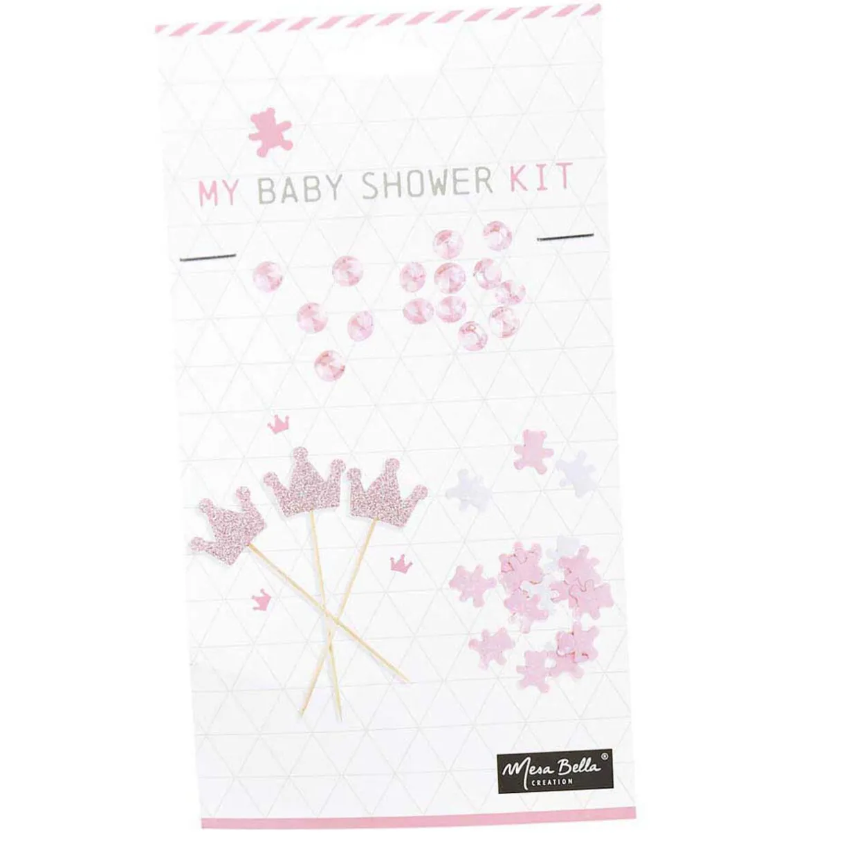 Comprend 6 pics couronne de couleur rose L. 17 cm, une cinquantaine de minis diamants roses ø 5 mm et des minis oursons roses et blancs dim. 2×2 cm.