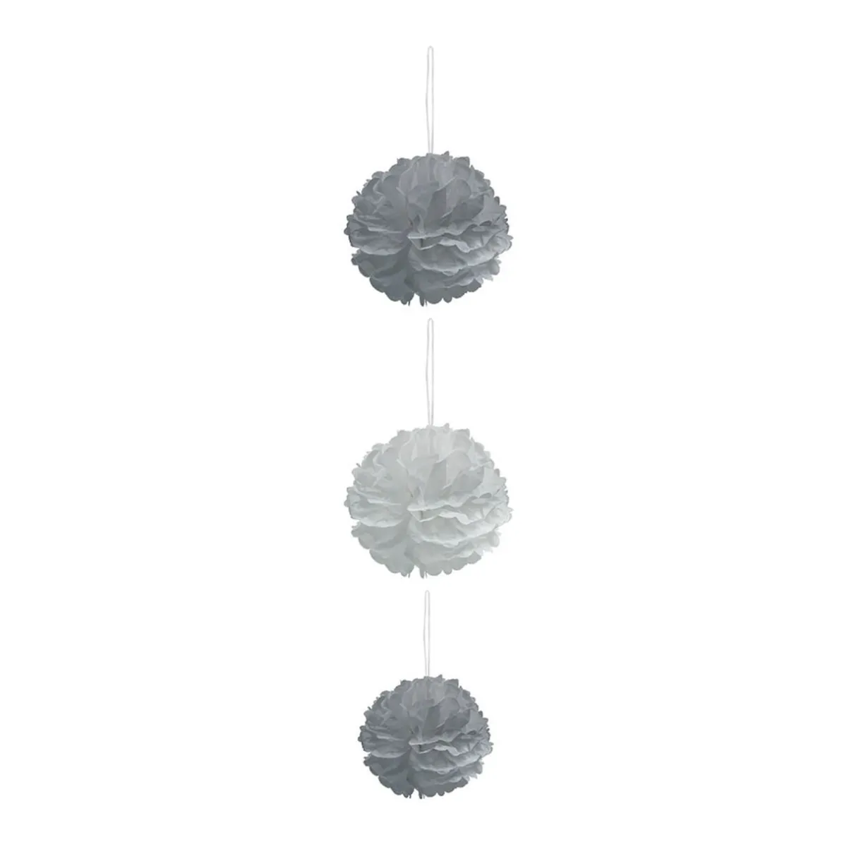 Suspension composée de 3 boules en papier effet chiffon de couleur grise.