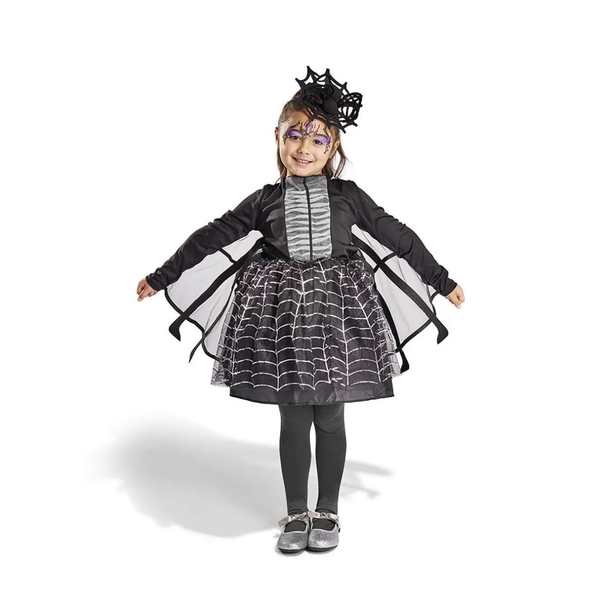 Déguisement araignée pour enfant composé d’une robe effet toile et d’un serre-tête assorti, parfait à l’occasion !