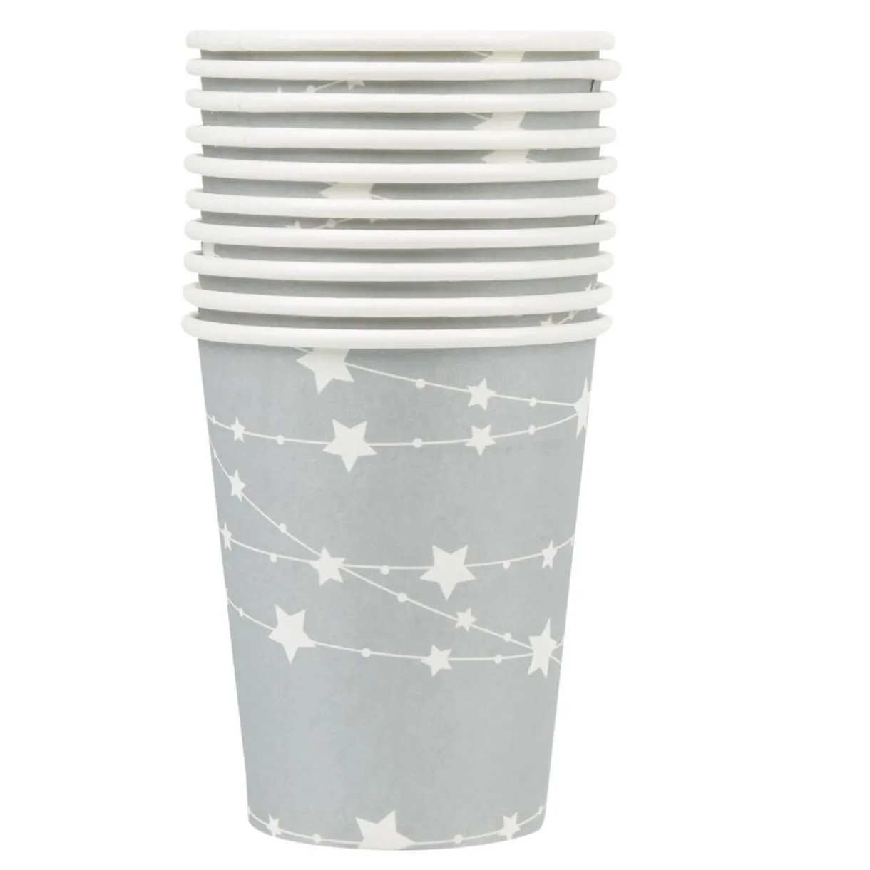 10 gobelets argentés à étoiles blanches d’une contenance de 25 cl en carton, dim.13,8 x 7.5 cm.