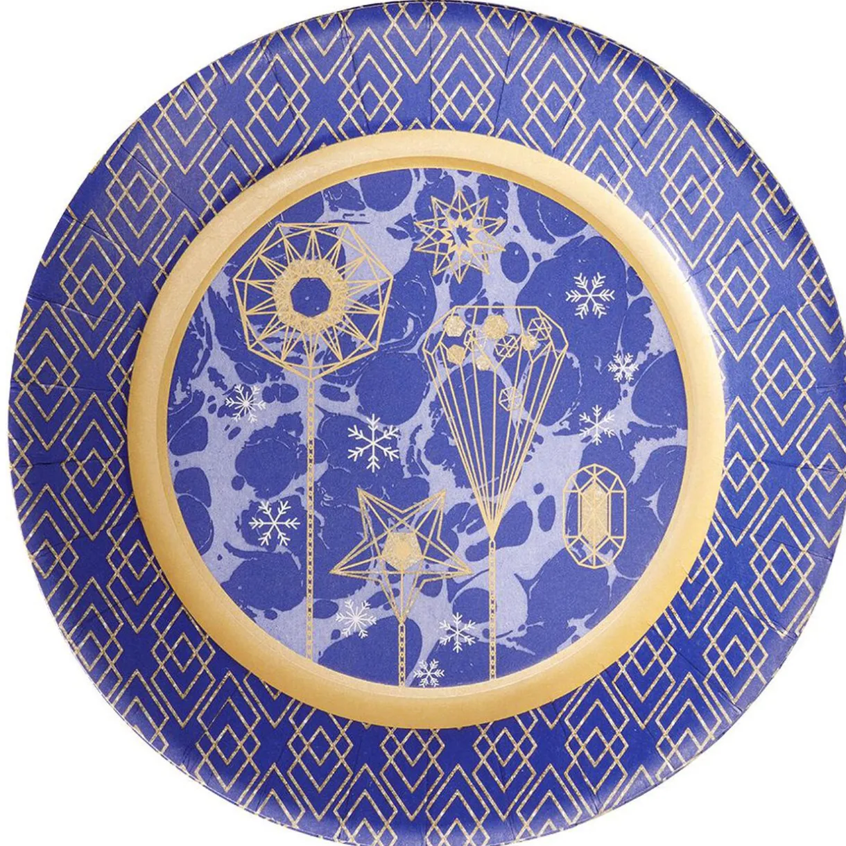 Lot de 10 assiettes rondes en carton bleu imprimé doré, idéal pour une décoration chaleureuse et raffinée de votre table de réveillon.
