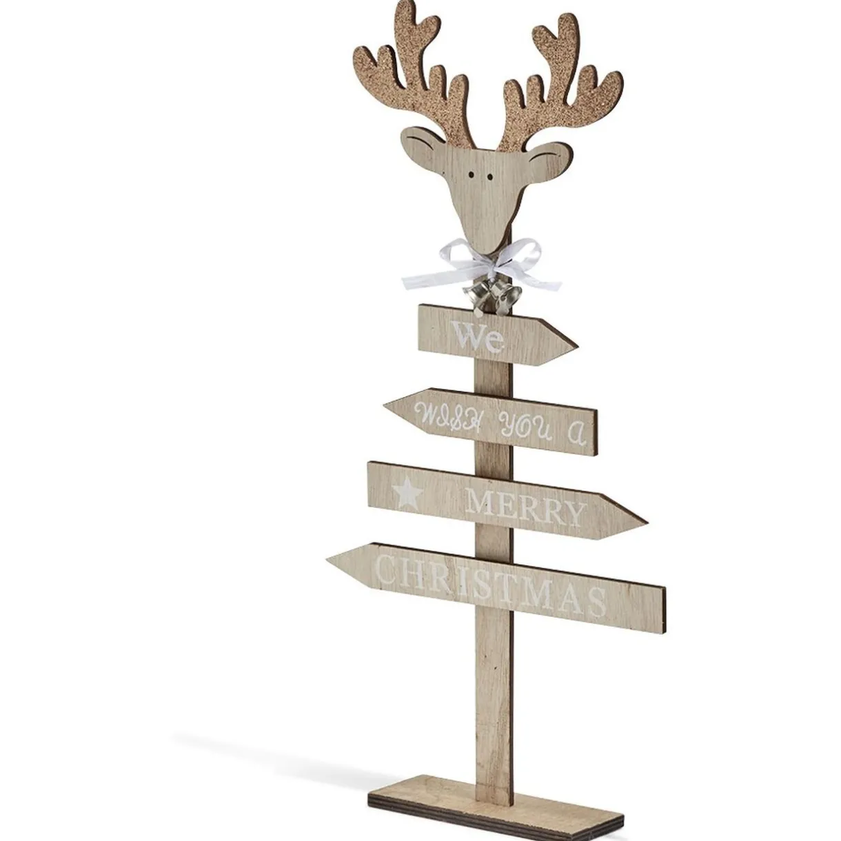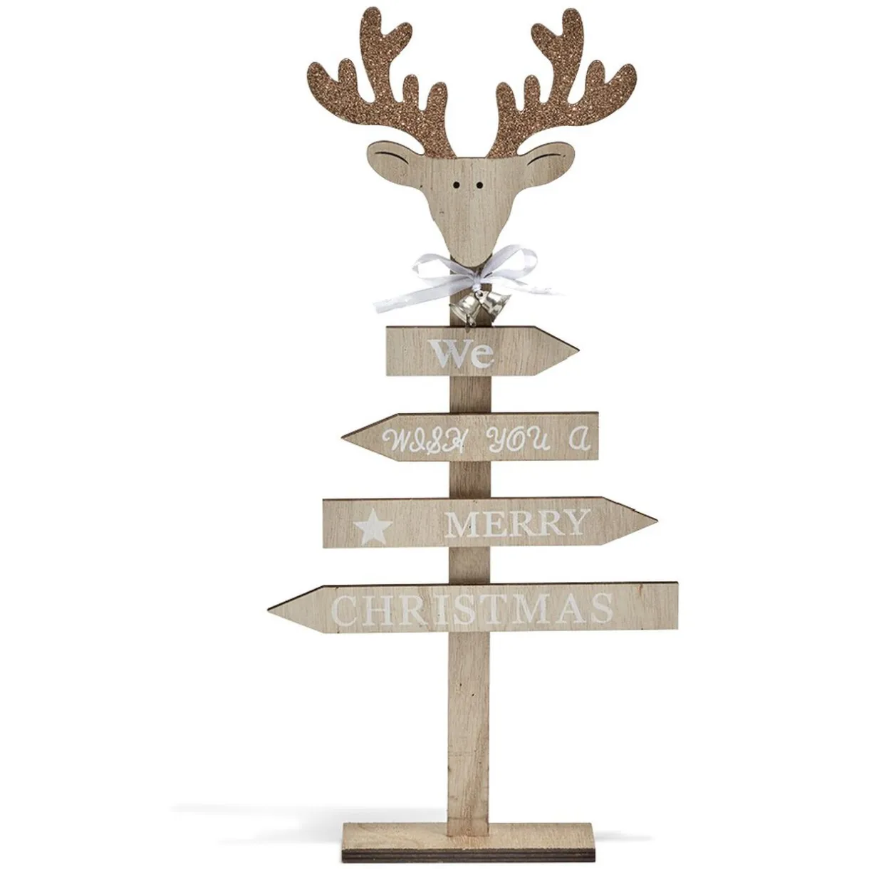En forme de sapin, le panneau est composé d’une tête de renne, de clochettes et de l’inscription « We wish you a merry christmas ».