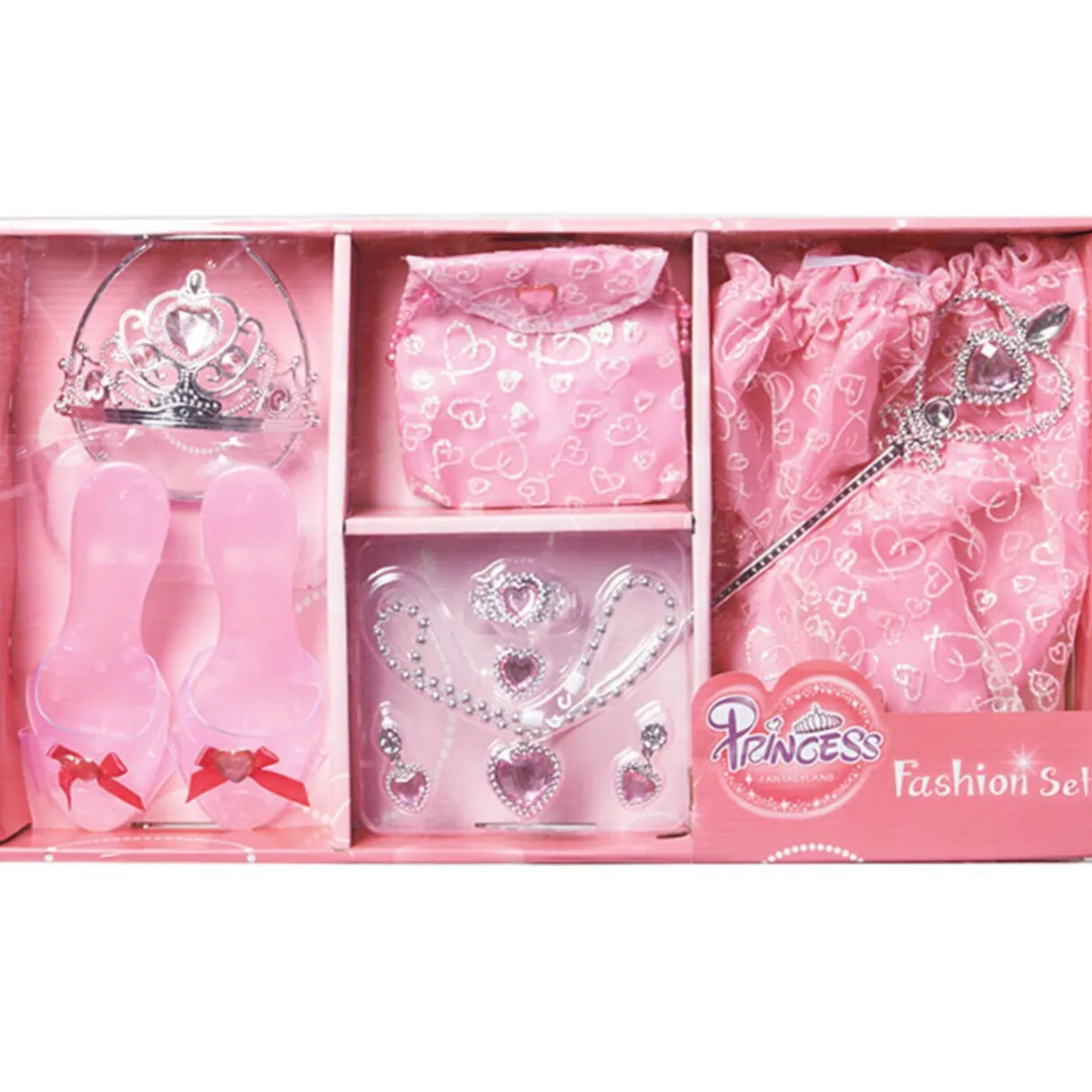 Panoplie de princesse comprenant 1 robe, 1 diadème, 1 baguette, 1 sac, bijoux et chaussures, plastique. De 3 à 6 ans.