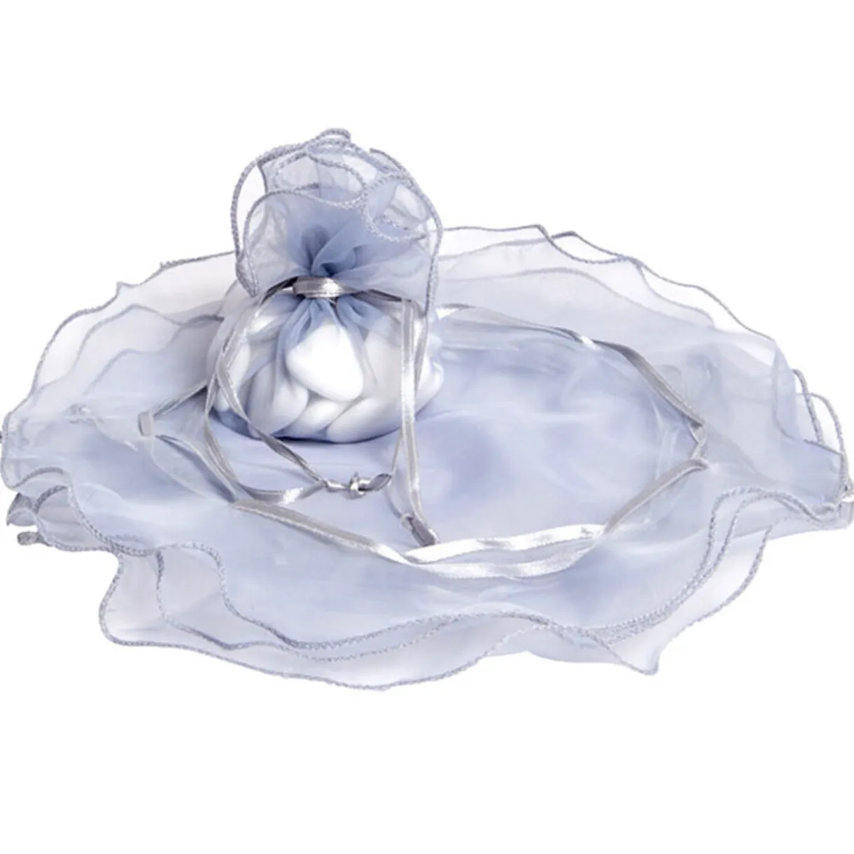 6 bourses rondes à dragées avec ruban, coloris argenté, ø 24 cm, polyester et organza. Vendu sans dragées.