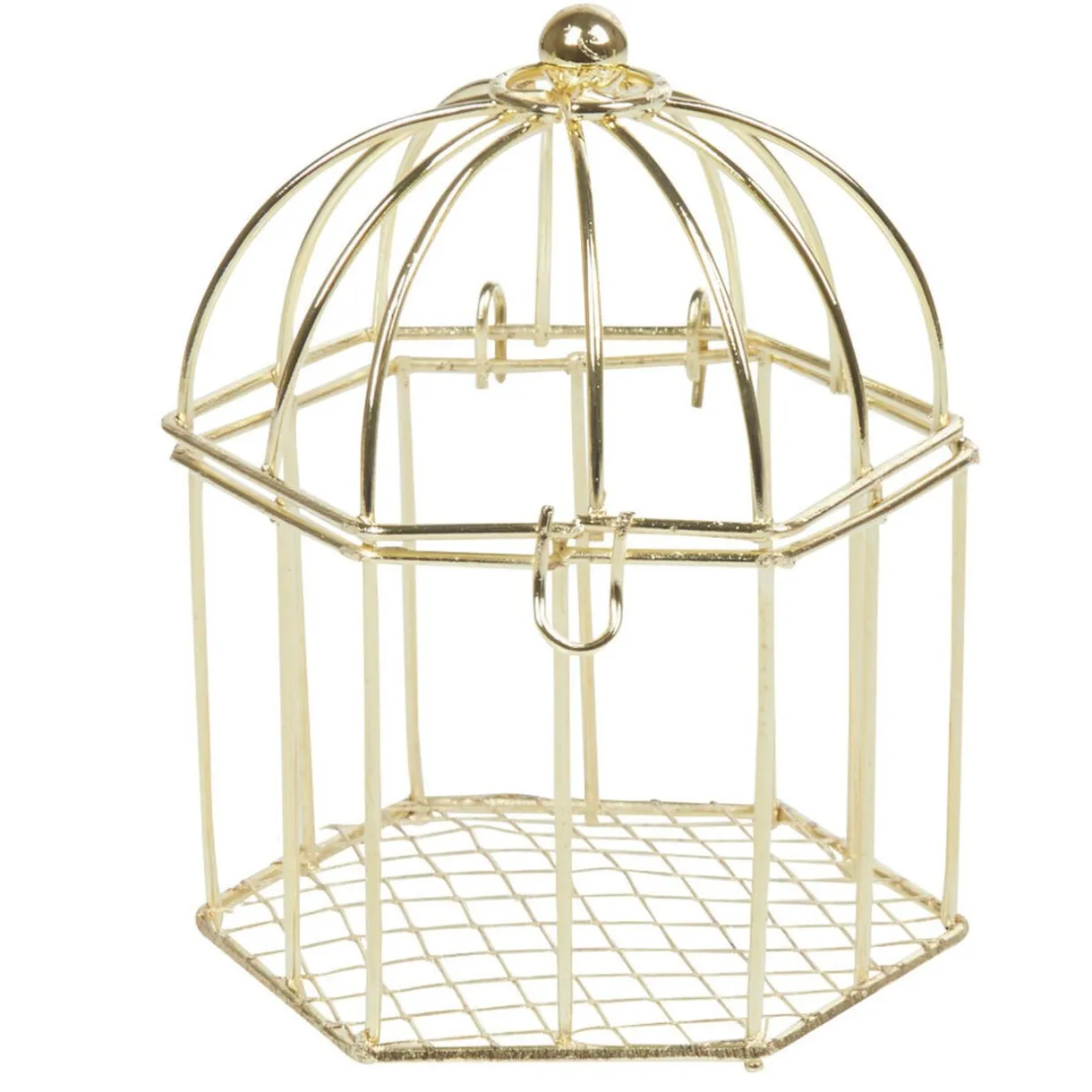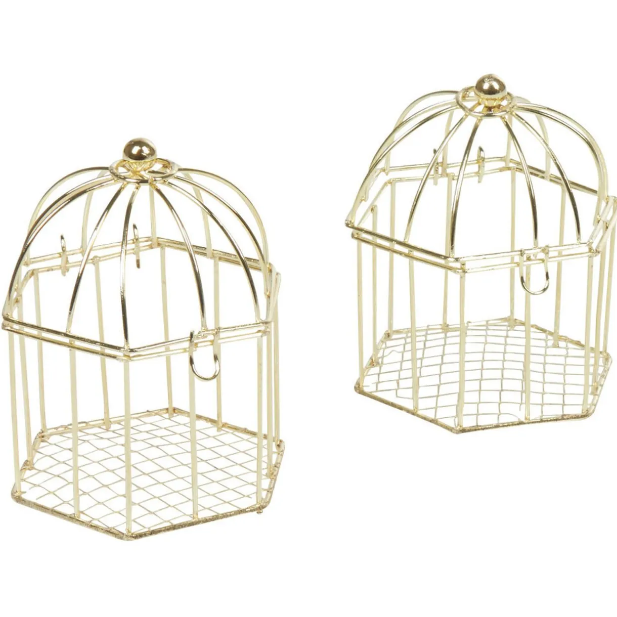 2 boîtes à dragées en forme de cage à oiseaux dorée, dim. 6,5xh.8 cm, métal.
