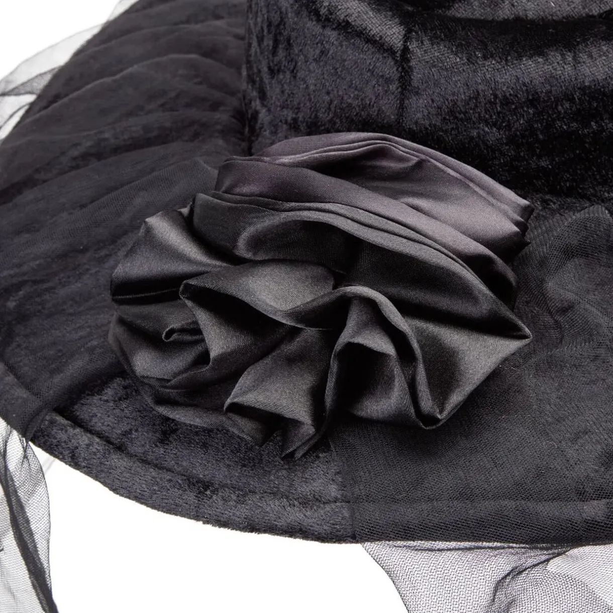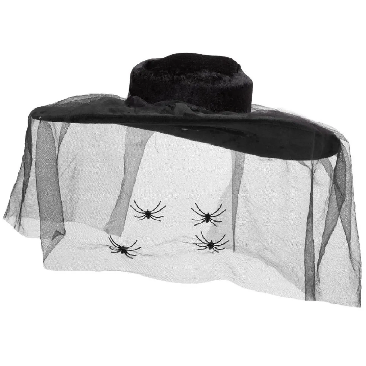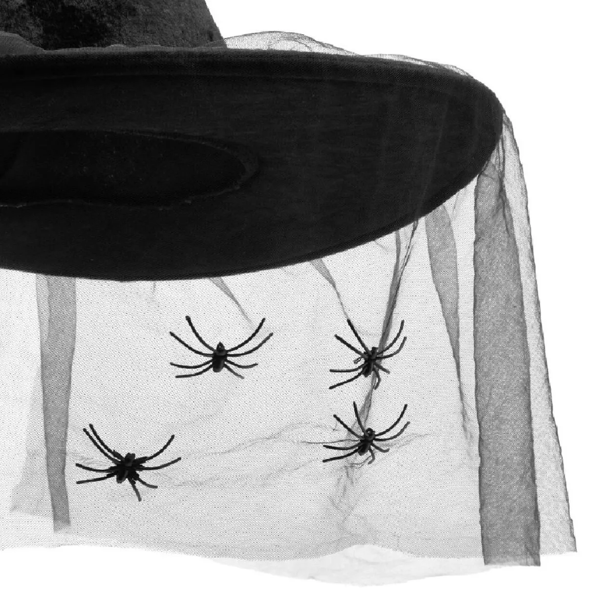 Un chapeau noir en polyester avec un voile de toiles d’araignées. Idéal pour déguisement d’Halloween.<b