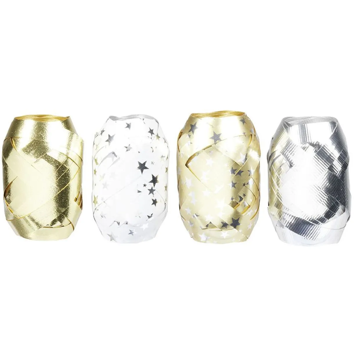 Lot de 4 bolducs métallisés dont 1 uni doré, 1 uni argenté, 1 doré/1 blanc imprimé étoiles argentées.
