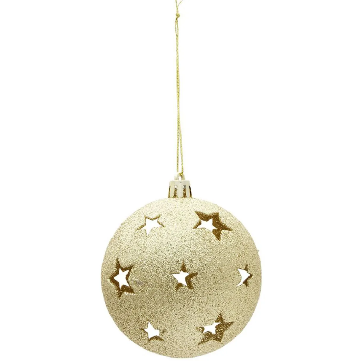 Boule de Noël ajourée dorée à paillettes avec des trous en forme d’étoile pour décorer votre sapin.