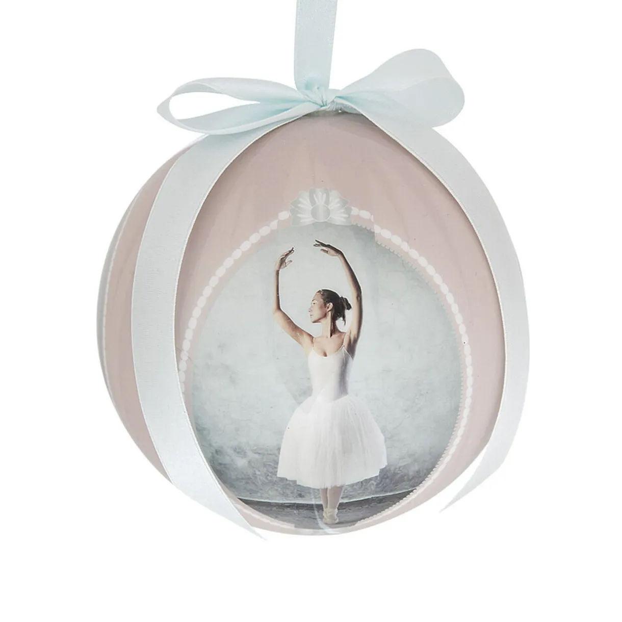 Apportez une touche raffinée à votre sapin avec cette boule de Noël en mousse recouverte d’un papier plastifié avec imprimé rose et bleue représentant une danseuse.