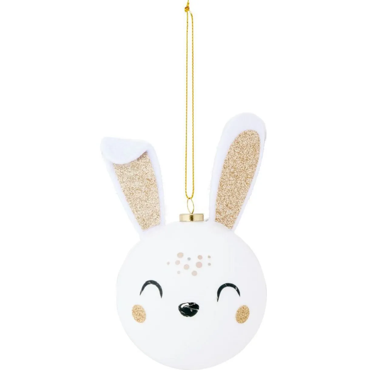 Pour une décoration de Noël toute mignonne, optez pour cette boule en forme de tête de lapin blanche et dorée pailletée.