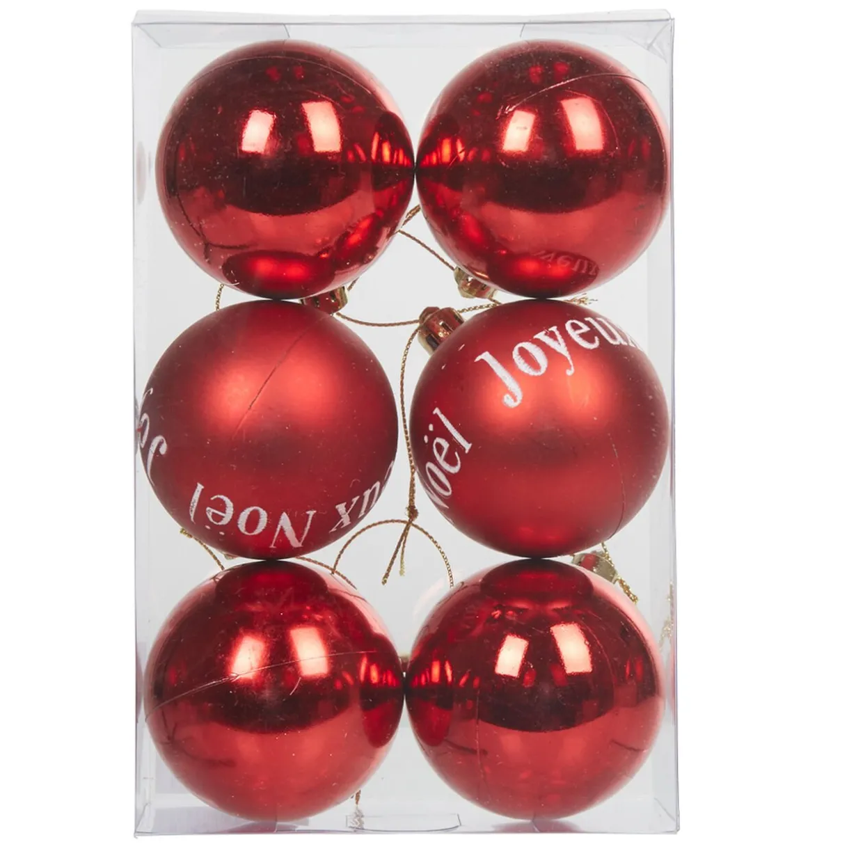 Il comprend 4 boules brillantes unies et 2 rouges mates avec inscription « joyeux Noël ».