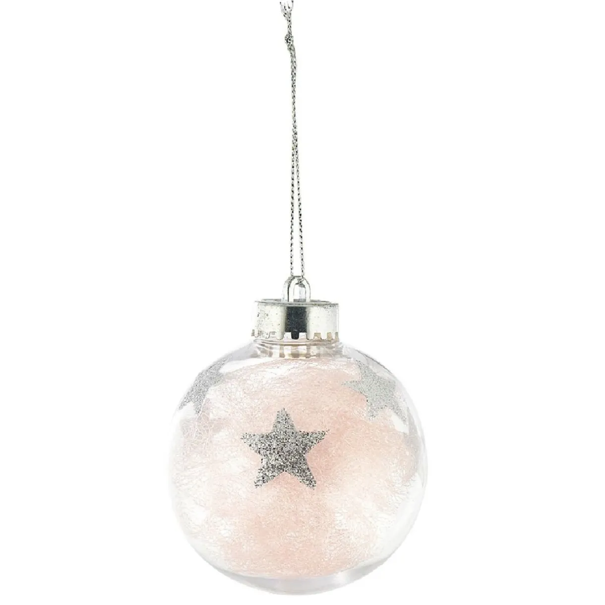 Boule de Noël transparente garnie de tulle et imprimée d’étoiles.