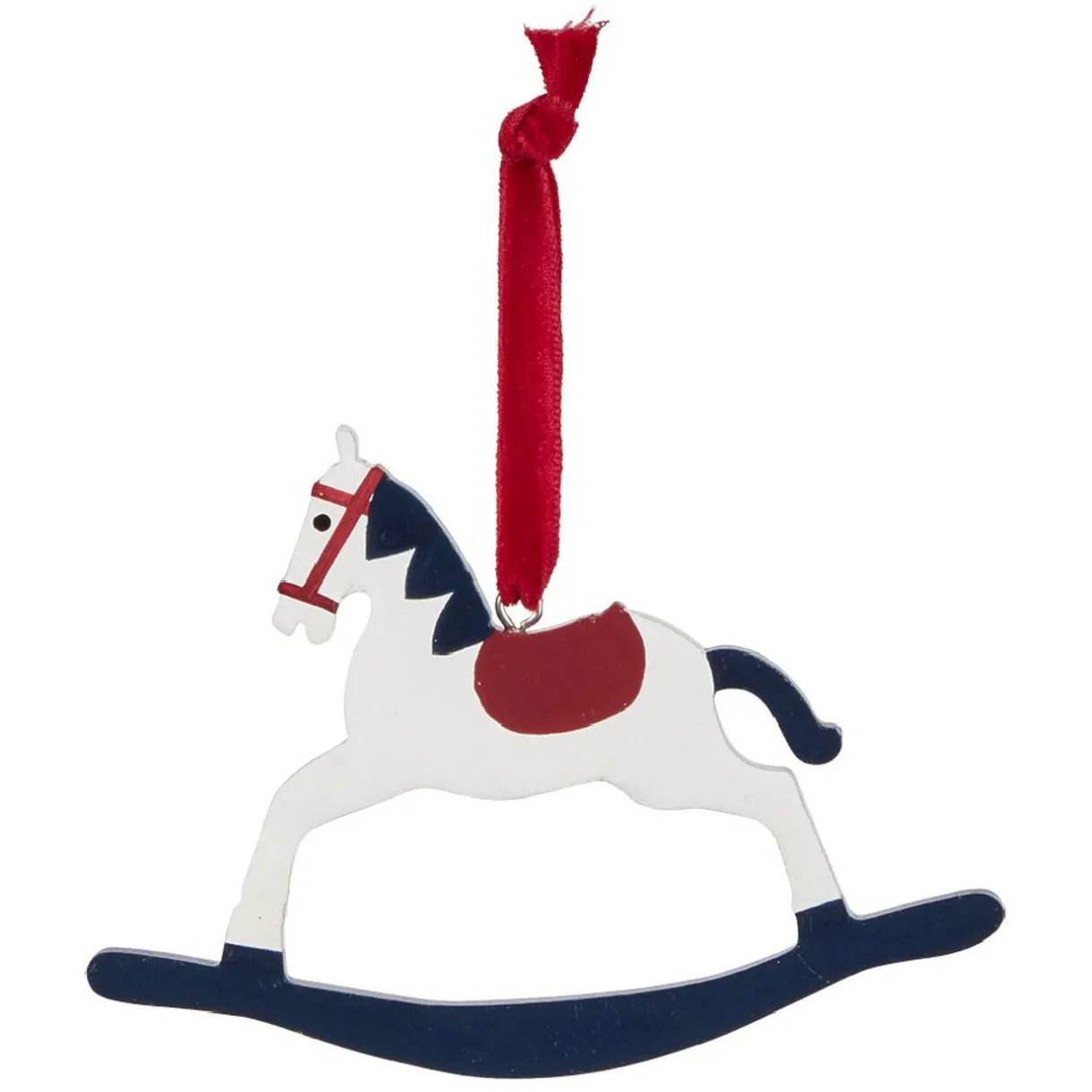 Cheval à bascule en bois blanc et rouge à suspendre à votre sapin pour lui apporter une note vintage.