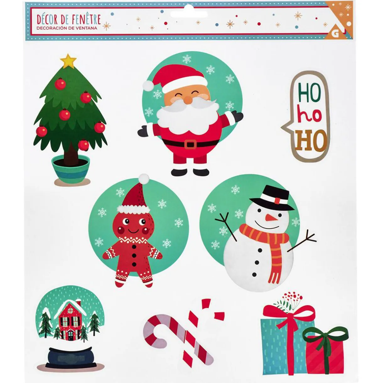 Set de décorations électrostatiques pour vitres représentant des personnages et objets à l’effigie de Noël.
